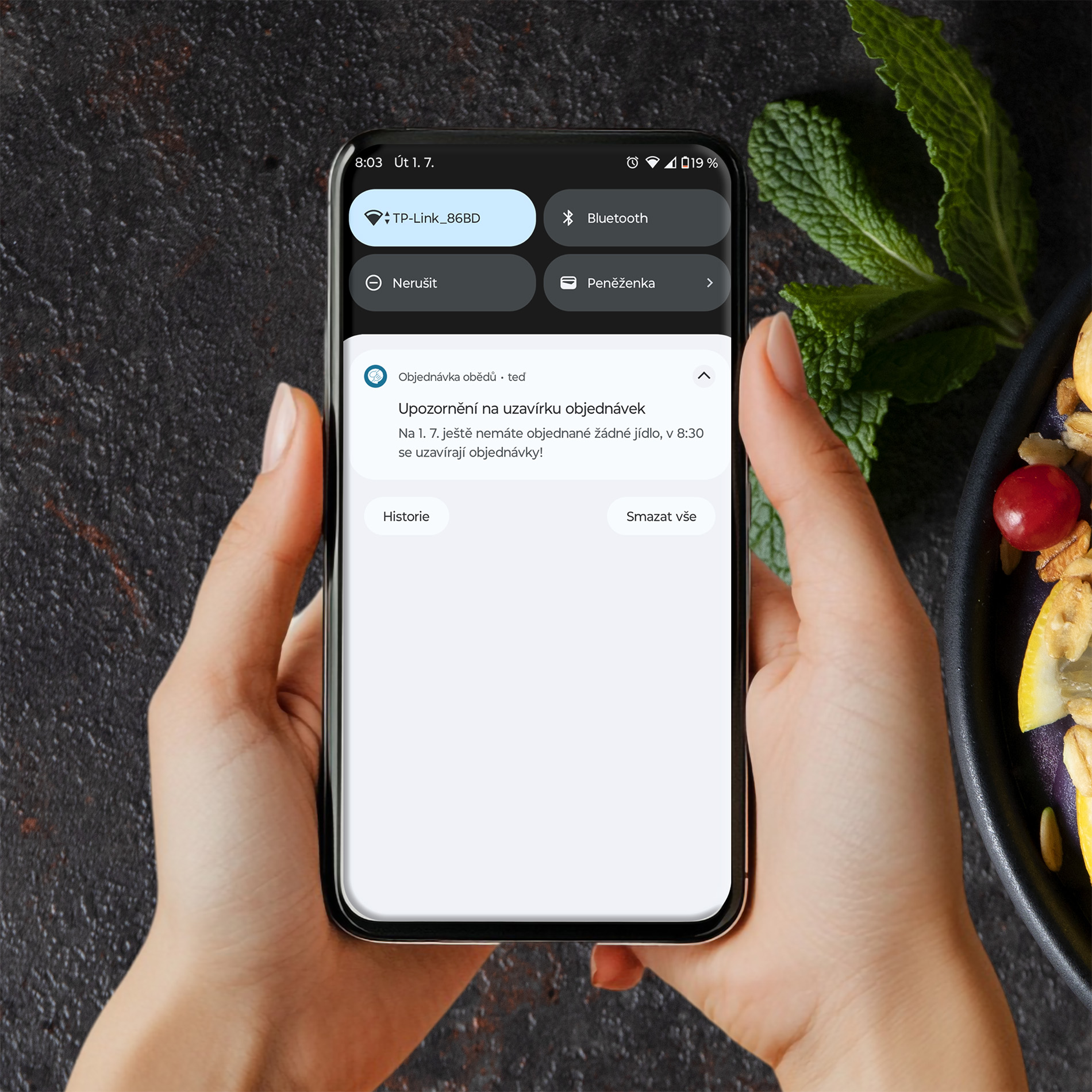 - Včasné upozornění – přibližně dvě hodiny před uzávěrkou telefon pípne a zobrazí zprávu ve stylu: „Za chvilku se uzavírají objednávky na pondělí. Nezapomněl/a sis náhodou objednat jídlo?“